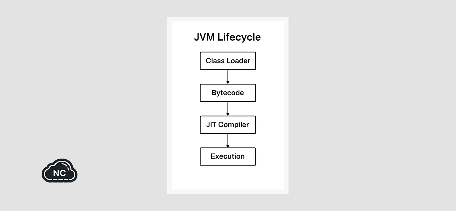 En la siguiente imagen puedes apreciar de forma estandar el ciclo de vida de la JVM (Java Virtual Machine) o Máquina Virtual de Java: