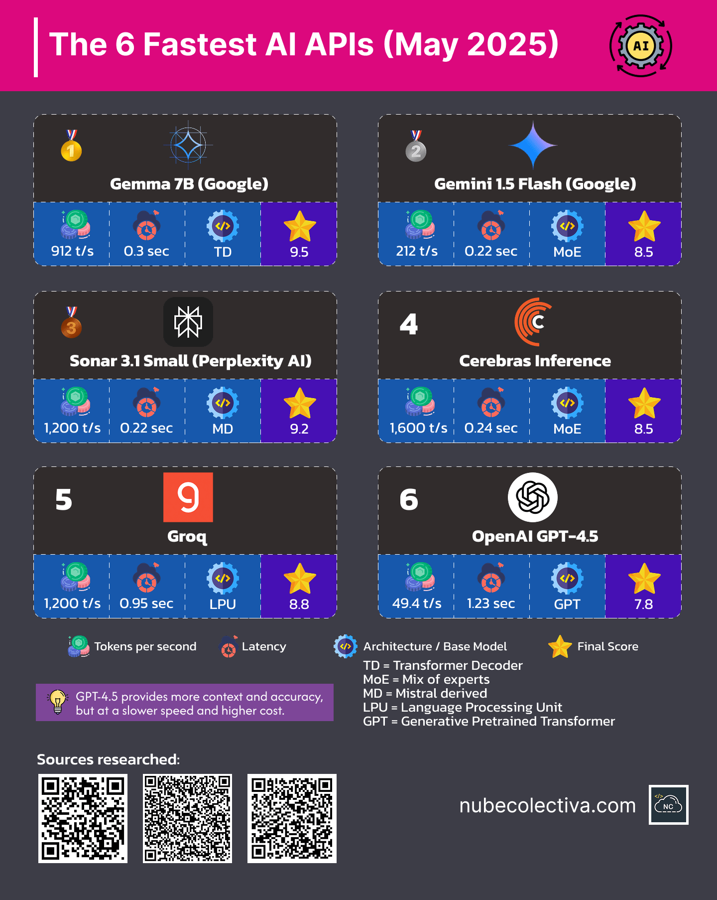 The following image shows the 6 fastest Artificial Intelligence APIs on the market, along with key technical details: